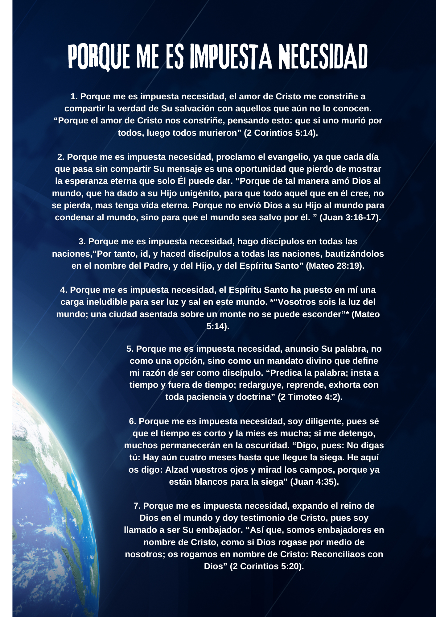 “Pues si anuncio el evangelio, no tengo por qué gloriarme; porque me es impuesta necesidad; y ¡ay de mí si no anunciare el evangelio!” 1 Corintios 9:16